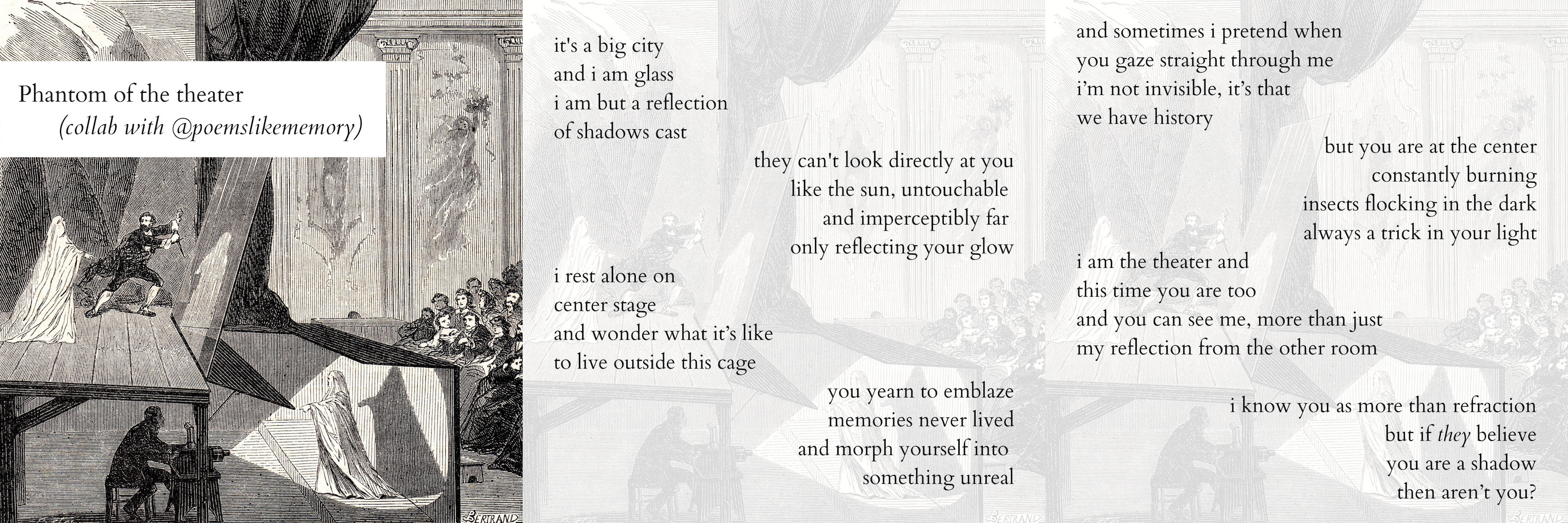 It started with her mentioning that a piece I had written reminded her of a concept called Pepper’s Ghost. I wasn’t familiar with the idea, so I asked her to explain, and I fell in love with both her explanation and the concept itself. It felt unfair to just take the idea and run with it, though, so I suggested we collaborate. I took a stab at some hodgepodge lines, using this phase to find our narrative point of view within such a specific phenomenon.